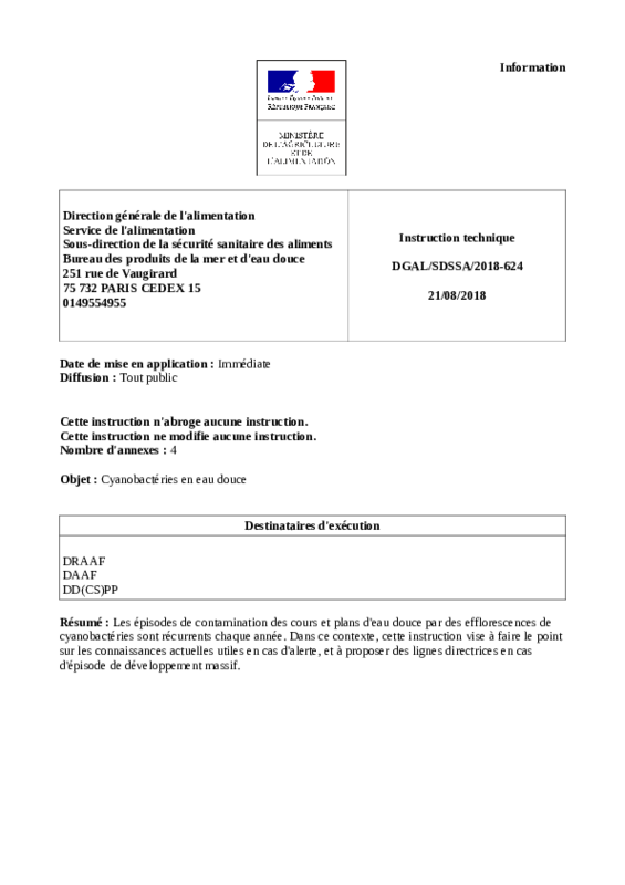 Instruction technique DGAL/SDSSA/2018-624 du 21/08/2018 relative aux cyanobactéries en eau douce Adobe Acrobat PDF |